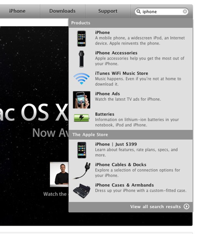 This experience enhancement gives consumers yet another glimpse into what it is like to own a Mac before owning one. Apple understands how important it is to manage the customer experience (or perhaps prospect experience, as their market share is still small) at every interaction. This is particularly important online, as consumers have a short attention span and are jaded quickly if something doesn’t work or live up to their expectations. Obviously this is much easier to accomplish when you are searching your own site and products vs. the open Internet. But Apple has executed with elegance in design. Apple is now the third largest manufacturer of computers behind HP and Dell. In their stores they have all but eliminated the cash register, as the advisers on the floor can use a hand held device to ring your purchase and email you a receipt. Seems they are always about bringing innovation to someone else’s expertise.