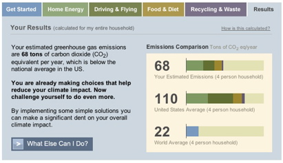 I used each site to calculate my total household emissions, and each one came up with a slightly different answer, but they were relatively close. In a matter of 3 minutes time here are the results for my household as calculated by The Nature Conservancy site.