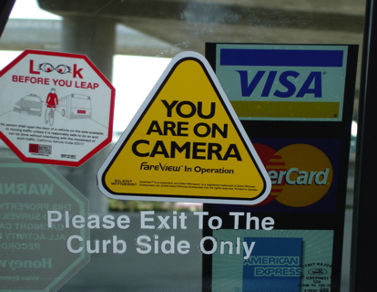 San Francisco is on of my favorite cities. What’s not to like? It’s scenic, progressive, and has so many landmarks; Golden Gate Bridge, Coit Tower, the Embarcadero, Alcatraz. While traveling to the airport from the downtown district by taxi the other day, I noticed something I haven’t seen before. The cab had a small camera positioned above the driver’s inside rear view mirror pointed at the back seat (circled in red below). A passenger notice was posted on the driver’s side rear window that read, “You are on camera.” The service was labeled FairView™. Also on the sign was a reference to Silent Witness®, a maker of video surveillance equipment (acquired by Honeywell in 2003).