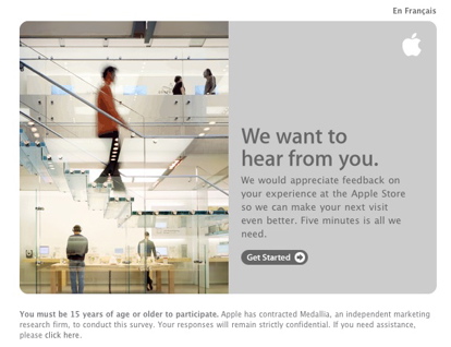Apple was referenced as a regular user of NPS. I made a purchase at my local Apple store yesterday. They hate cash registers and so my purchase was done in the middle of the store by a clerk tapping on a wireless device. My receipt was emailed to me. Here’s the email that has a link to the online satisfaction survey (also a great way to collect email addresses).