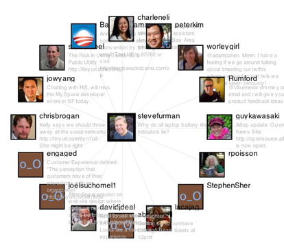 Neuro Productions, the company that created this application seems to be one person, Hris Timmerman. He lives in Antwerp (Belgium) and is a self-proclaimed Adobe flash addict, and apparently a good one. He created the Twitter network browser application. It allows you to enter a Twitter name and see their network blossom in your browser window right before your eyes. The results show the avatar of the Twitterite, their last update and all their connections with their avatars and last updates.