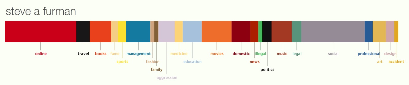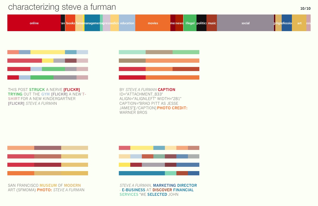 Of course anyone who visits the site will immediately put in their own name, quickly followed by others. Perhaps friends, co-workers, family, famous people. It’s fascinating experiment. After typing in my name and kicking off the system you get a building persona series of pages. This is mine about half way through.