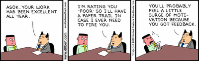 Most of the time I have had the great fortune to work with first class individuals. I can’t stress enough how critical it is to spend the time and energy in preparation for an energetic and meaningful performance discussion. This is not a time to short change effort or communication. It’s absolutely critical you don’t end up in a Dilbert cartoon.
