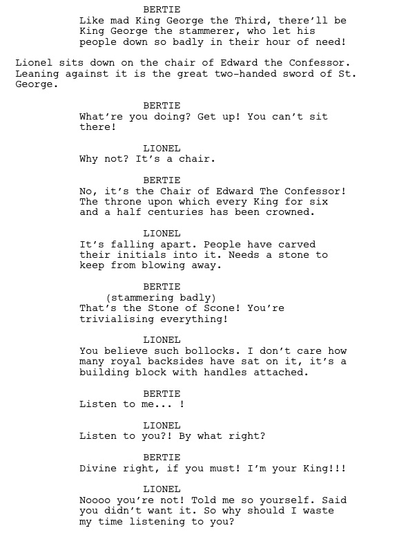 This year we are given a rare gift in The King’s Speech, directed with immense skill by Tom Hooper, who is clearly the poster child for all that’s right about Masterpiece Theatre. It’s a true story of George VI who became an accidental King when his brother suddenly stepped down to be with the woman he loved. One small problem. George has a horrible stutter and even worse case of stage fright. Bad combination. The King’s wife, played solidly by Helena Bonham Carter, finds a speech therapist who learned his craft in a non-traditional manner by working with shell-shocked soldiers in an Australian war. That success allowed him to parlay his experience into a living in London. The screenplay (download here) was penned by David Seidler. Mr. Seidler fills his pages with the crisis and spectacle of the royal family, but cleverly reveals it little by little through one-on-one conversations between this true blue blood and an Australian sans credentials. This device is carried off masterfully and molds our emotional responses throughout the full running time.