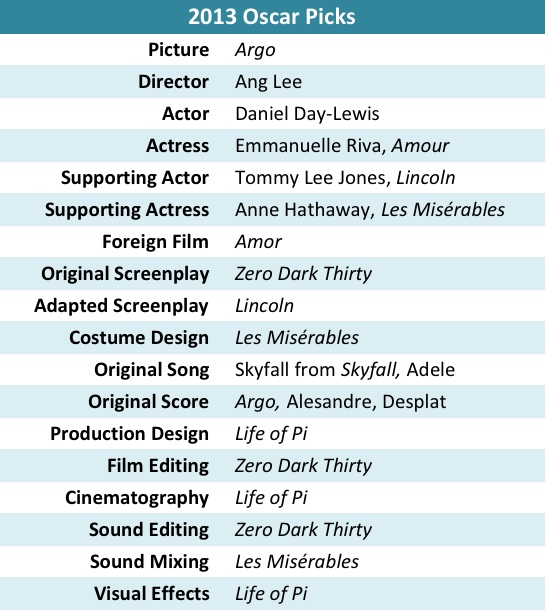 I have tremendous respect for Zero Dark Thirty, but I don’t believe the Academy will award it best picture. It may have stirred up too much controversy for the Academy crew. But beyond that it rakes up strong emotions that many of us have tried to move beyond this past decade. Instead I think the Academy will go with the more likable Argo, which has had broad, popular appeal. Even though the film has embellished of some facts for added drama, it blends another time with satisifying emotions. I’m never that concerned with getting each and every fact right. We know Hollywood has never called itself a truth factory. I’m settling in on the following.