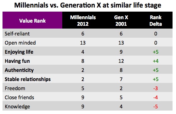 Another bit of interesting research came from a study on values Millennials rated as important vs. Gen X’ers rating at a similar life stage. Millennials value enjoying life, having fun, authenticity and stable relationships much higher than their Gen X counterparts. They moved freedom, close friends and knowledge down in importance.
