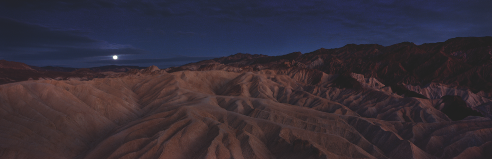 This photograph of Death Valley was taken in the evening when the moon was small and low on the horizon, looking as if it were a marble held between two fingers of a cloud. Gazing at the rough, heavily eroded landscape with its tawny violet cast, we can say that what we see is beautiful, that Death Valley has been the subject of a remarkable portrait.